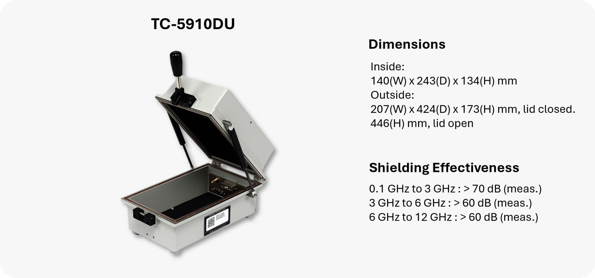 Manual-operation shield boxes optimized to perform 5G tests between 0.1 GHz to 67 GHz on larger devices such as tablets, laptops, and desktops.