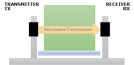 The transmitter sends a signal of a known power through the material. Then, the microwaves encounter water molecules. The oscillation of the water molecules makes the signal lose power, and the weakened signal can thereafter be calculated into a moisture measurement result in percent of the material's volume and weight.
